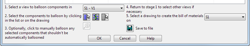 Die untere Hälfte des Dialogfelds Stückliste enthält Anweisungen und Optionen zum Anwenden von Bezugskreisen und Beschriftungen auf Komponenten in Zeichnungen, die für die Stückliste ausgewählt sind.