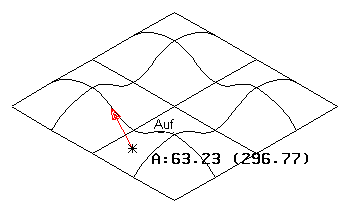 Vorgabemäßig werden nur Entformungswinkel von Positionen auf den Flächenkurven gemessen. Sie können den Entformungswinkel von Positionen innerhalb eines Flächenfelds messen, indem Sie die UMSCHALTTASTE gedrückt halten. Der Entformungswinkel wird von der Hauptebene zur Normalen des Punkts auf der Fläche unter dem Cursor gemessen.