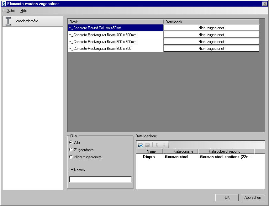 - Das Dialogfeld Elemente werden zugeordnet wird nur geöffnet, wenn bei der Übertragung bestimmte Profilnamen (definiert in Revit) in der aktiven Profildatenbank von Robot nicht erkannt werden.