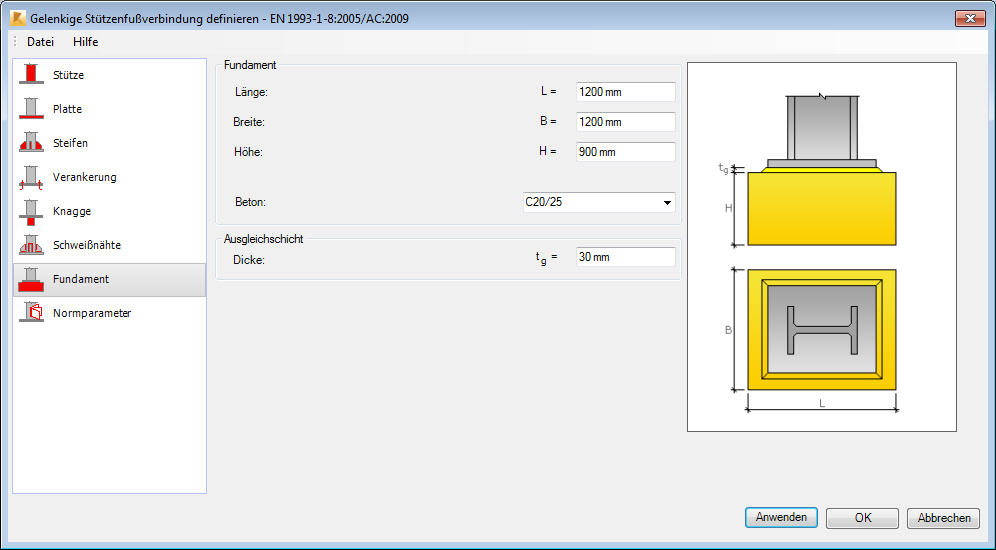 Verwenden Sie die Registerkarte Fundament, um die grundlegenden Parameter des Fundaments zu definieren; Sie können auch eine Betonklasse für das Fundament angeben. Diese Informationen werden zur Berechnung der Beständigkeit des Stützenfußes gegen den Anpressdruck des Betons herangezogen. Im Feld Ausgleichschicht können Sie die Parameter einer Ausgleichschicht definieren, die normalerweise eingesetzt wird, um die Stütze korrekt zu positionieren und sicherzustellen, dass die Fußplatte vollständig mit dem Fundament in Kontakt ist.