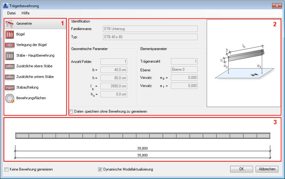 Das Dialogfeld zur Erstellung der Bewehrung von Balken verfügt über drei Hauptbereiche: