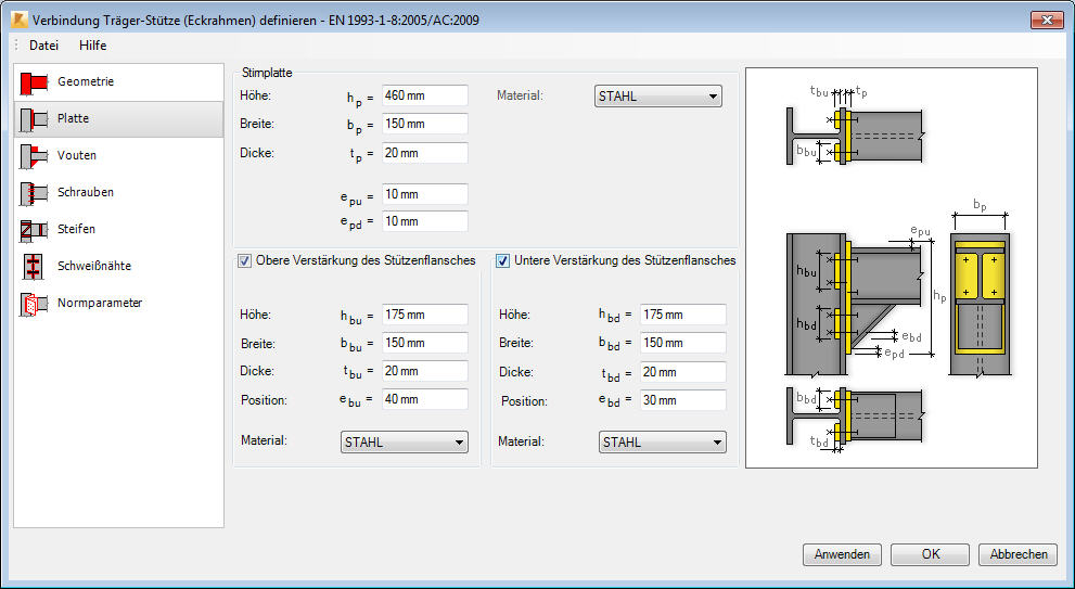 Verwenden Sie die Registerkarte Blech, um die Parameter der Stirnplatte und der Flanschbleche zu definieren.