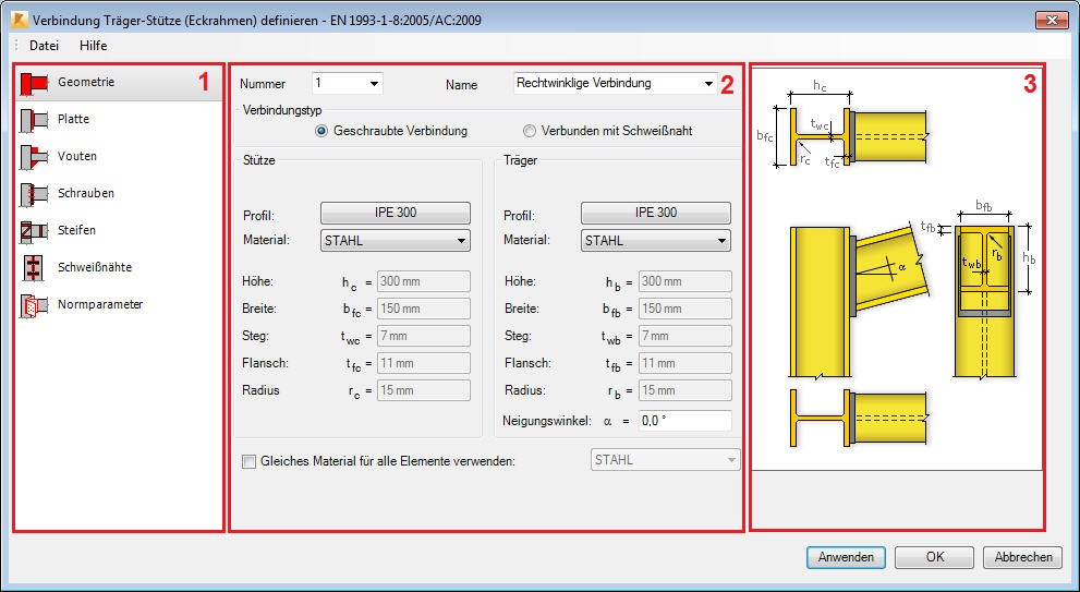 - In der Mitte definieren Sie die Parameter eines ausgewählten Elements der Stahlverbindung.