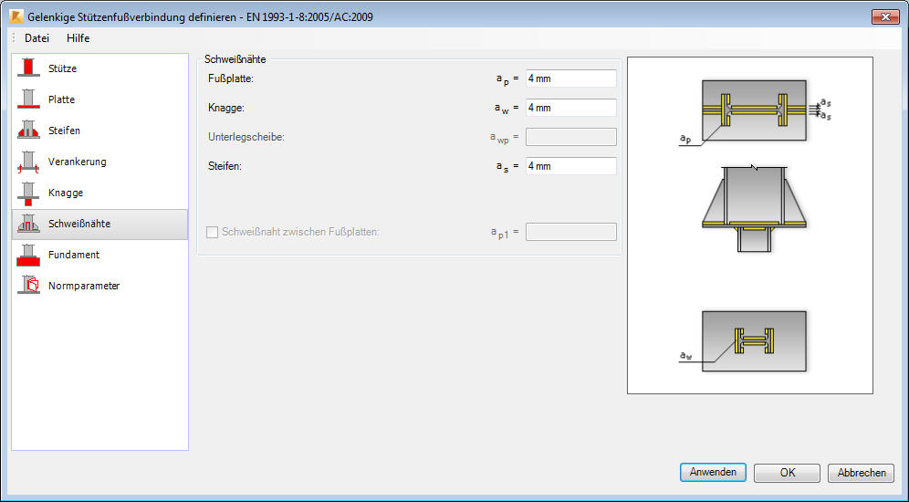 Verwenden Sie die Registerkarte Schweißnähte, um die einzelnen Elemente des Stützenfußes (wie Fußplatte, Knagge, Unterlegscheibe oder Steifen) zu definieren.