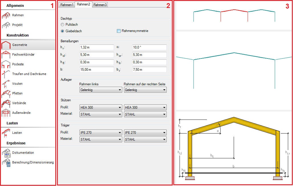 - Im rechten Teil finden Sie den grafischen Viewer, der in drei Teile unterteilt ist und die definierten Elemente der Rahmenkonstruktion anzeigt.