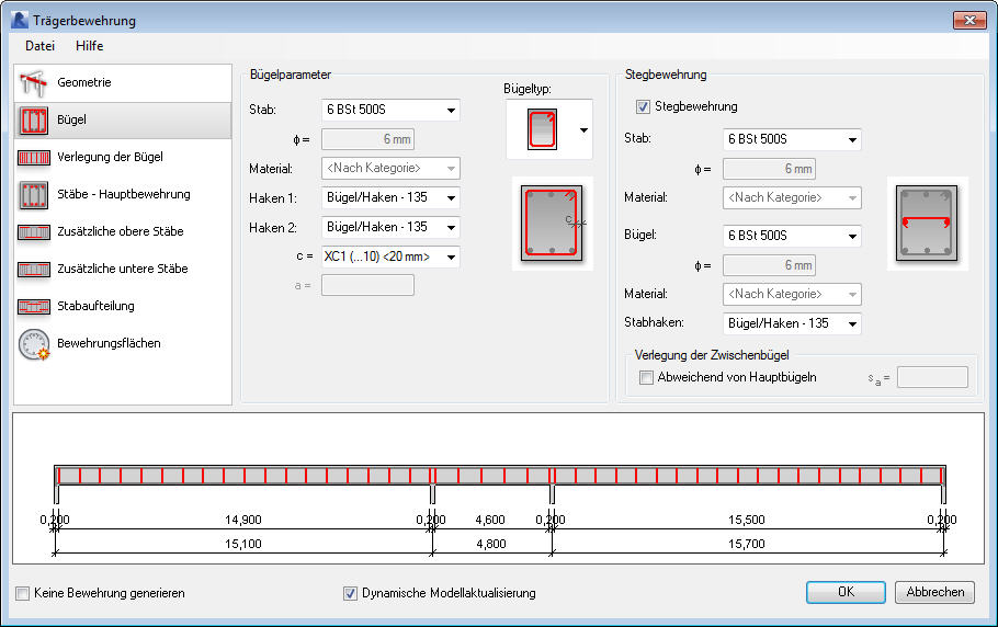 Es gibt verschiedene Parameter für die Querbewehrung (Bügel) im Dialogfeld Balkenbewehrung: