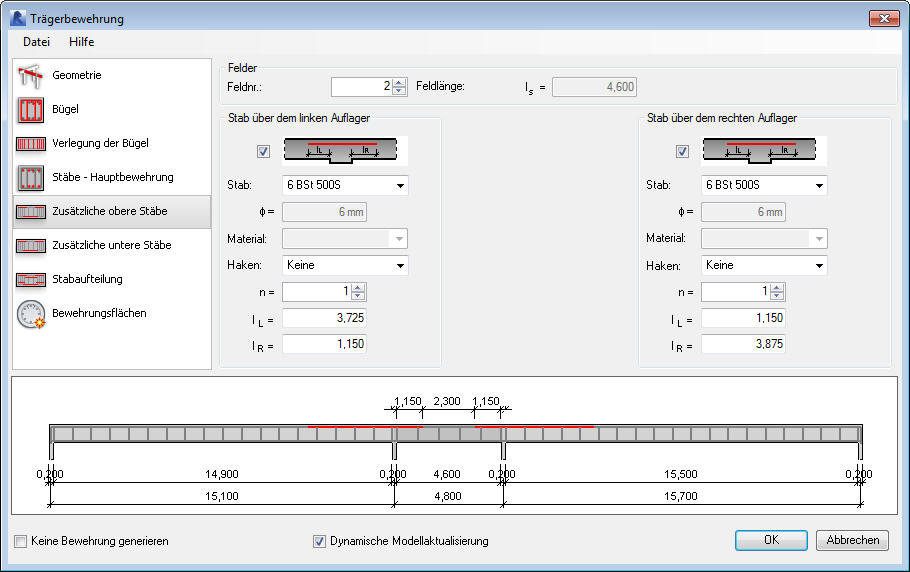 Die Bewehrungsstäbe werden separat für jedes Balkenfeld generiert. Zu den Parametern für diese zusätzliche oberen Stäbe gehören:
