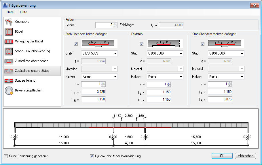 Die Bewehrungsstäbe werden separat für jedes Balkenfeld generiert. Zu den Parametern für diese zusätzliche unteren Stäbe gehören: