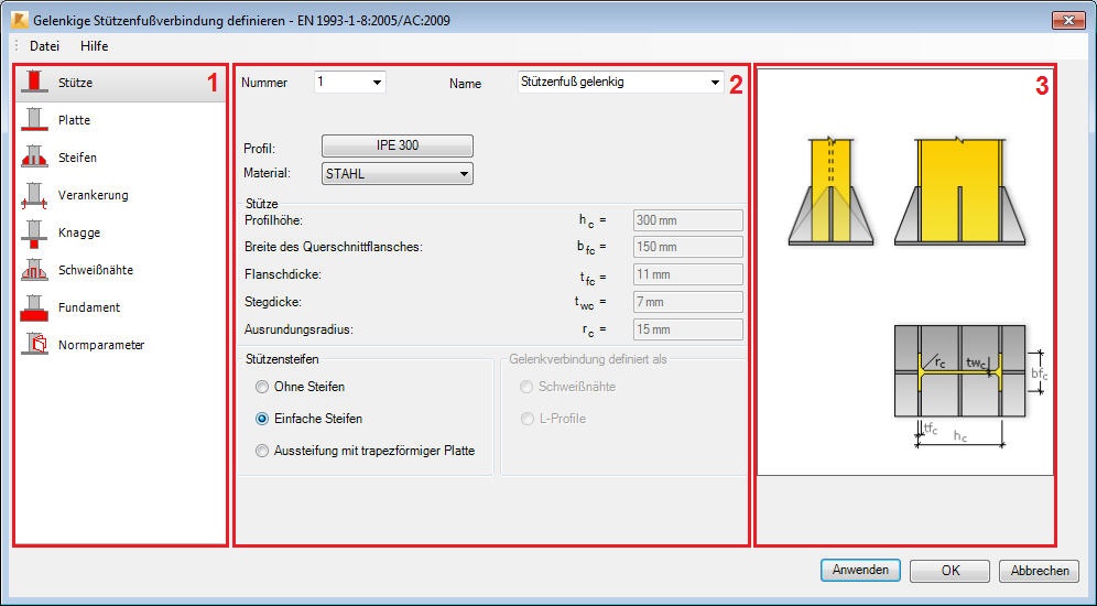 - In der Mitte definieren Sie die Parameter eines ausgewählten Elements der Stahlverbindung.