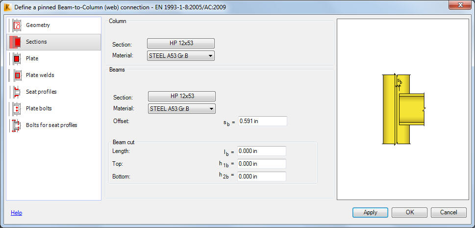 Verwenden Sie die Registerkarte Schnitte zum Definieren der Profile für Stützen und Balken in der Verbindung.