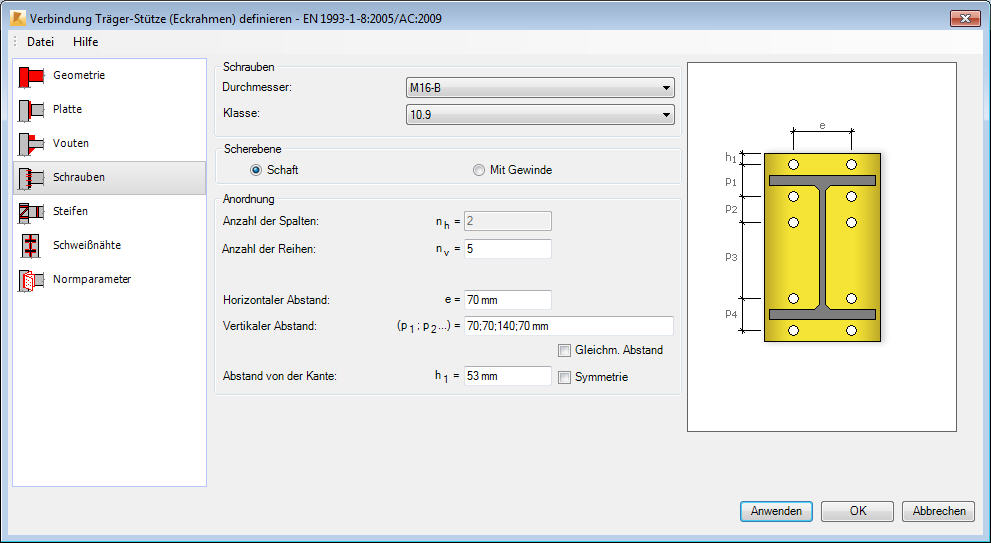 Verwenden Sie die Registerkarte Schrauben zum Definieren der Schrauben für die Verbindung des Stützenflansches mit der Stirnplatte.