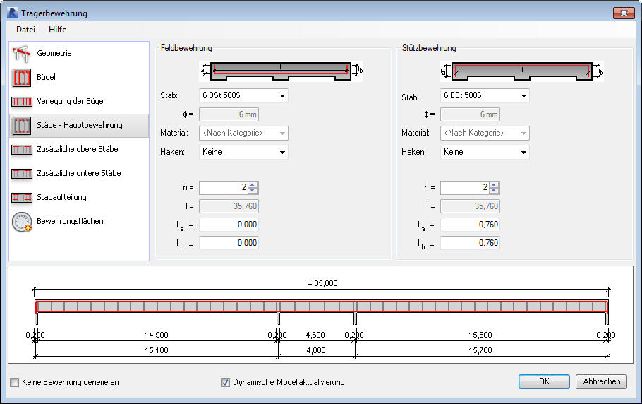Die Längsbewehrung wird entlang der gesamten Länge des Balkens generiert. Zu den Parametern für die Längsbewehrung gehören: