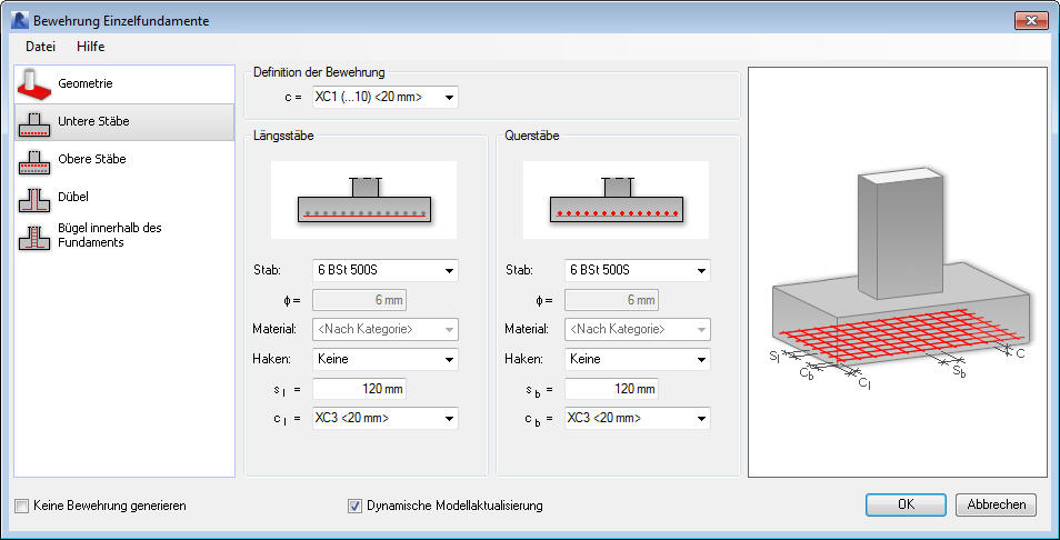 Es gibt verschiedene Parameter für die untere Bewehrung im Dialogfeld Bewehrung der Fundamente: