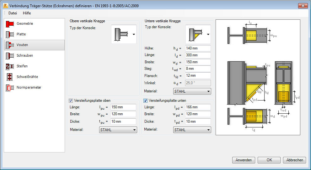 Verwenden Sie die Registerkarte Vouten zum Definieren verschiedener Typen von Vouten zwischen den Balkenflanschen und der Stirnplatte.