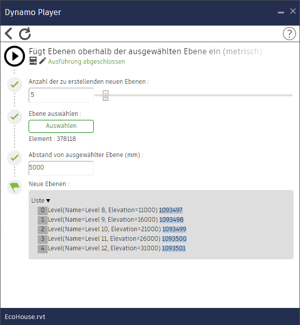 Nach erfolgreicher Ausführung des Skripts ändert sich dessen Status in Ausführung abgeschlossen. Im Dialogfeld Eingabe werden für jeden in Dynamo Player angezeigten Beobachtungsblock Informationen zum Ergebnis angezeigt.