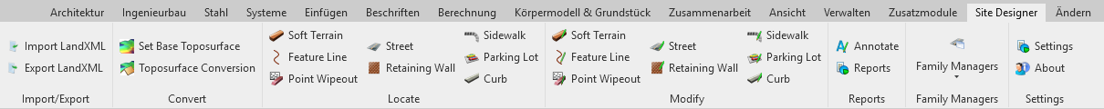 Wenn Sie Site Designer installieren, wird die Registerkarte Site Designer in der Multifunktionsleiste von Revit vor der Registerkarte Modify angezeigt.