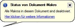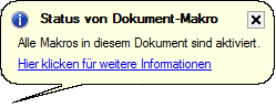 | Vor Aktivieren von Dokumentmakros fragen | Benutzerdefiniert. | Sie werden in einer Warnmeldung aufgefordert, die Makros entweder zu aktivieren oder zu deaktivieren. Je nach Ihrer Antwort wird das entsprechende Symbol angezeigt. Dies ist die Standardeinstellung. |