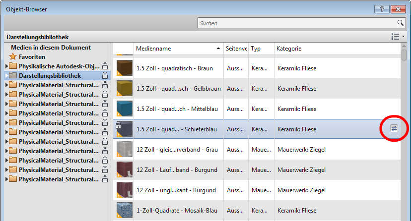 Sie können ein bestehendes Objekt durch ein anderes ersetzen, das Sie im Objekt-Browser auswählen. Die Eigenschaften des neuen Objekts werden für das Material übernommen.