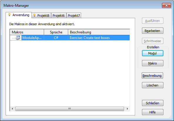 Das neue Modul wird erstellt und im Makro-Manager in der Liste angezeigt. Sie können jetzt ein oder mehrere Makros hinzufügen.