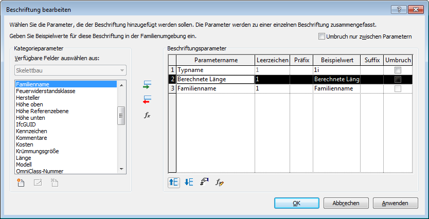 Im Dialogfeld Beschriftung bearbeiten weisen Sie Beschriftungen einzelne oder mehrere Parameter zu.