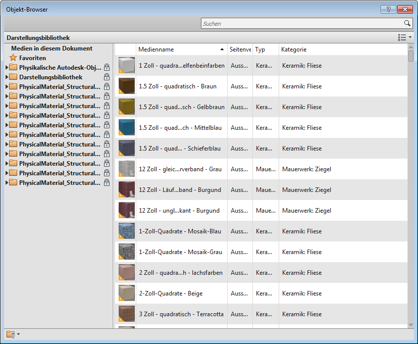 Symbol) für Materialien. Auf diese Weise wird sichergestellt, dass Ansichten und gerenderte Bilder die neuesten, hochwertigsten Darstellungen von Materialien verwenden.