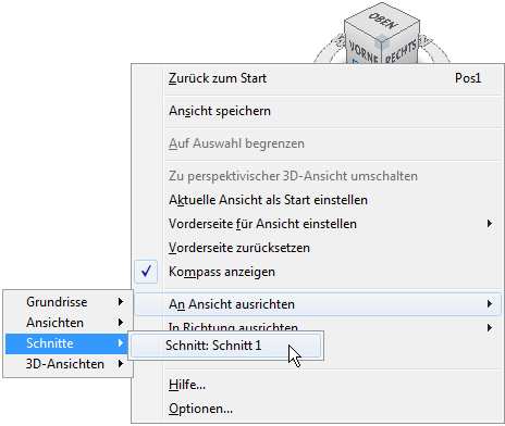 Mit dem ViewCube können Sie eine 3D-Ansicht an beliebigen Draufsichten, Schnitt- und Ansichtsdarstellungen oder 3D-Ansichten im Projekt ausrichten.