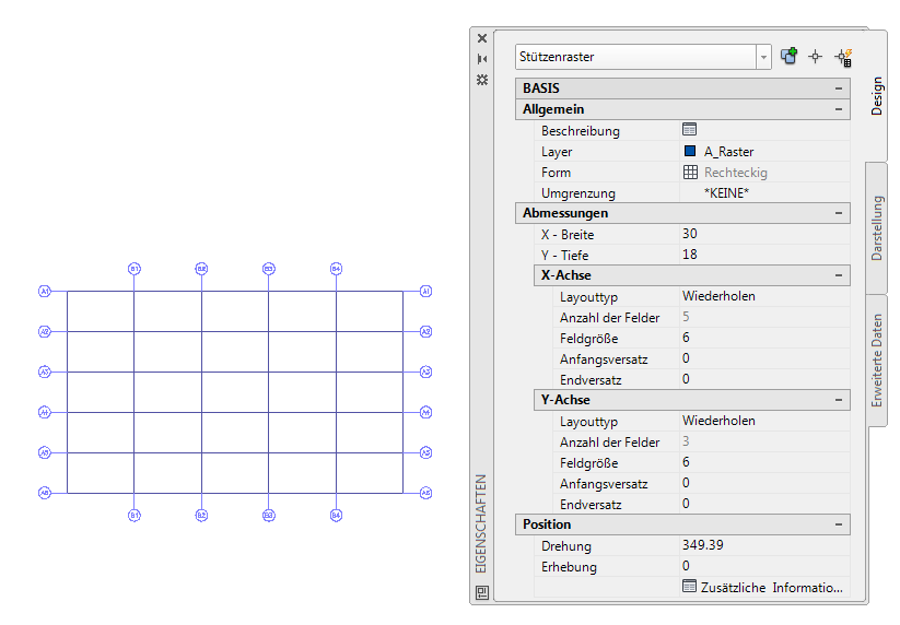 Die folgenden Eigenschaften eines AutoCAD Architecture-Rasters bleiben beim Importieren in Revit erhalten: