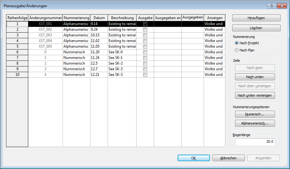 Sie können ein Projekt mit einer bestimmten Nummerierungsmethode (z. B. nummerisch) beginnen. Es ist möglich, die Methode später zu wechseln, um eine neue Projektphase als solche zu kennzeichnen. Die im Dialogfeld Planausgaben/Änderungen unter Reihenfolge angegebenen Nummern geben die Gesamtreihenfolge aller Änderungen im ganzen Projekt an, unabhängig von den im Einzelfall verwendeten Nummerierungsmethoden.
