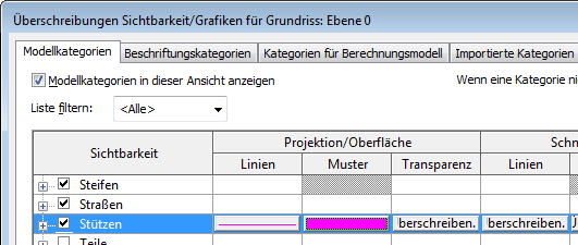 In der folgenden Abbildung sind in der Kategorie Stützen Überschreibungen für Projektion/Oberflächenlinien und Muster vorhanden.