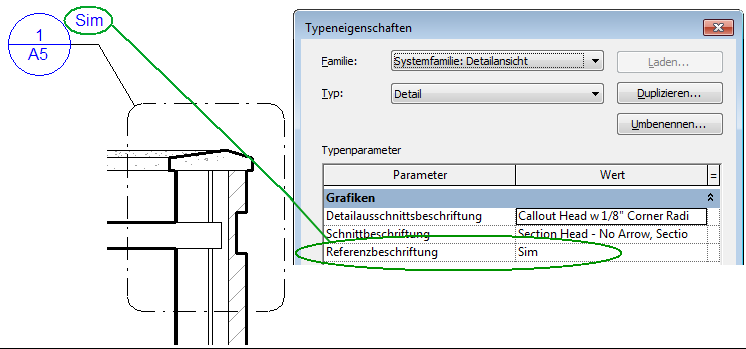 Standardmäßig enthält die Detailausschnittsbeschriftung eines Referenzdetailausschnitts eine Beschriftung wie z. B. Ähnl., eine Abkürzung von Ähnlich). Diese Beschriftung können Sie je nach Projekterfordernis bzw. Unternehmensvorgabe ändern. Sie können z. B. Spiegeln oder Umkehren als Referenzbeschriftung verwenden.