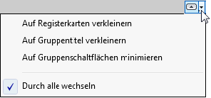 | Angeben der bevorzugten Methode zum Minimieren der Multifunktionsleiste | Klicken Sie rechts neben den Registerkarten der Multifunktionsleiste auf den rechten Pfeil, und wählen Sie das gewünschte Verhalten: Auf Registerkarten verkleinern, Auf Gruppentitel verkleinern, Auf Gruppenschaltflächen minimieren oder Durch alle wechseln.