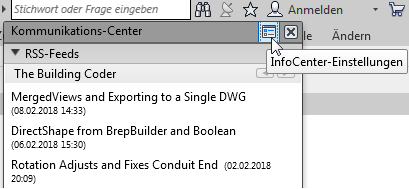 Wenn Sie über das Autodesk-Konto und das Kommunikations-Center verfügen, können Sie im Dialogfeld InfoCenter-Einstellungen die Einstellungen z. B. für Benachrichtigungen, RSS-Feeds und Autodesk-Kanäle anpassen. Um dieses Dialogfeld zu öffnen, klicken Sie oben in einem der Menüs Autodesk-Konto, Kommunikations-Center oder Favoriten auf die Schaltfläche InfoCenter-Einstellungen.