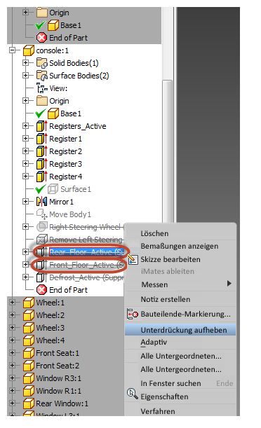 3. Aktivieren Sie im CAD-Modell die Features, die den Luftstrom durch die vorderen Bodenlüftungsöffnungen und die hinteren Bodenlüftungsöffnungen ermöglichen. Aktivieren Sie im Konsolenteil die folgenden Funktionen: