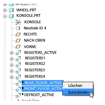 Legen Sie das Teil "console" (bzw. das Teil "console-r") als das Arbeitsteil fest, und aktivieren Sie den Teile-Navigator. Aktivieren Sie die Kontrollkästchen der einzelnen Features.