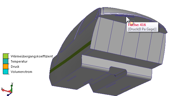 5. Durch die rechteckige Öffnung unter der Windschutzscheibe strömt kalte Luft in den Innenraum. Sie weisen dieser Fläche einen Temperatur- und einen Durchflusswert zu. Wählen Sie diese Fläche aus, und klicken Sie im kontextabhängigen Werkzeugkasten auf die Schaltfläche Bearbeiten.