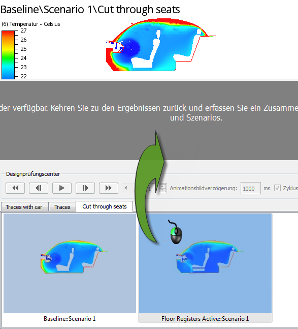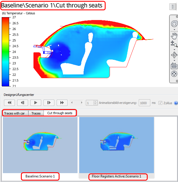 Durch das Hinzufügen von Lüftungsöffnungen vorn und hinten im Fahrgastraum konnten die Designanforderungen erfüllt werden, da die Temperaturunterschiede vom Dach bis zum Boden beim vorderen und hinteren Passagier geringer als 2° C gehalten werden konnten. Auch liegt der Temperaturunterschied in den Bereichen des vorderen und hinteren Passagiers unter 2° C. Das neue Design hat außerdem das Ziel einer gleichmäßigen Kühlung über den gesamten Körper eines jeden Passagiers erfüllt (die Ziele und Erfolgskriterien finden Sie in Übung 1).