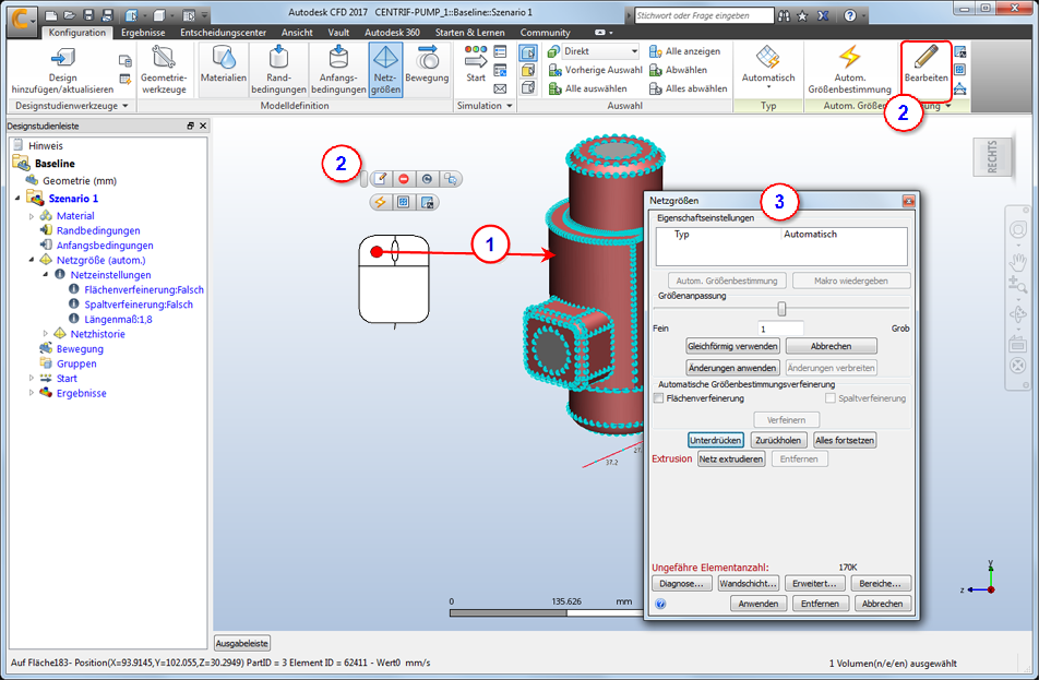 Verwenden Sie die Netzwerkzeuge zum Anpassen der Netzverteilung. Alle Werkzeuge sind über das Schnellbearbeitungs-Dialogfeld Netzgrößen verfügbar. Um den Arbeitsablauf zu vereinfachen sind viele auch im kontextabhängigen Werkzeugkasten und in der kontextabhängigen Gruppe verfügbar.