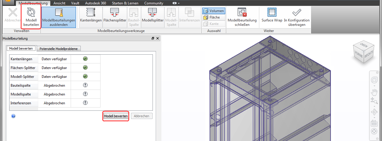 Da viele geometrische Probleme sehr klein sind, kann es schwierig sein, sie zu finden, insbesondere in einem komplexen Modell. Das Modellbewertungs-Toolkit prüft die Geometrie auf eine Reihe bekannter geometrischer Probleme, die in CAD-Modellen häufig auftreten.