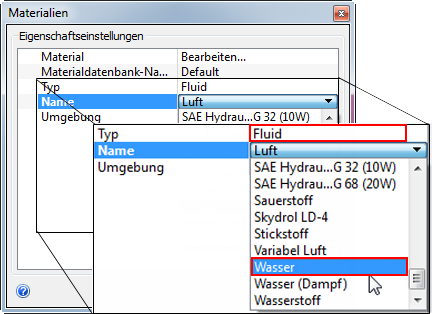 4. Stellen Sie sicher, dass im Schnellbearbeitungs-Dialogfeld der Typ auf Fluid gesetzt und Name als Wasser angegeben ist.
