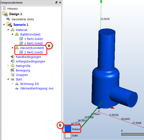 6. In der Designstudienleiste können Sie anhand der Teilfarbe überprüfen, ob das Material Wasser korrekt zugewiesen wurde: