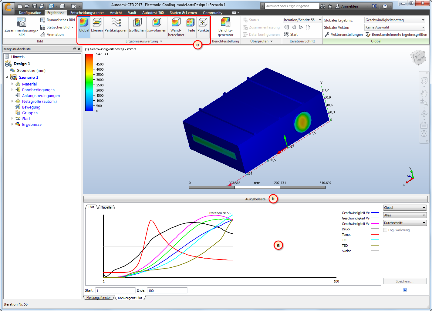 a. Der Konvergenz-Plot zeigt die Berechnungsbedingung während der Simulation. Wenn die Linien flach auslaufen, ändert sich die Lösung nicht mehr, und die Simulation ist abgeschlossen.