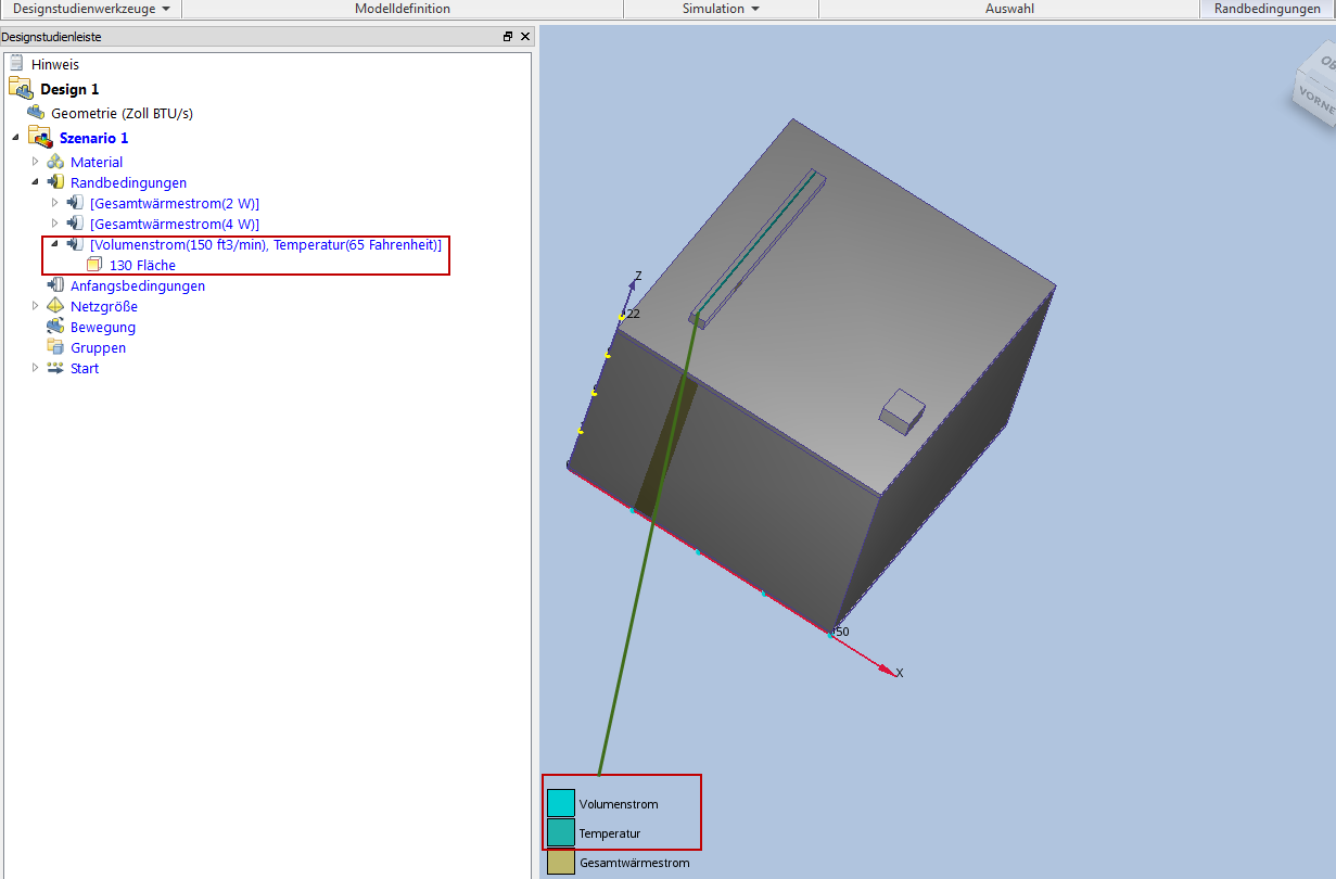 14. Um zu überprüfen, ob die beiden Randbedingungen korrekt angewendet wurden, überprüfen Sie die Designstudienleiste und die Farbstreifen auf der Zuleitungsfläche:
