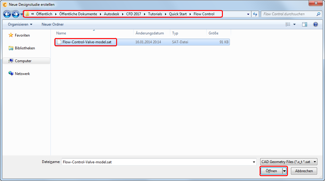 3. Navigieren Sie zu C:\Benutzer\Öffentlich\Öffentliche Dokumente\Autodesk\CFD 2018\Lernprogramme\Quick Start\Flow Control und wählen Sie Flow-Control-Valve-model.sat aus. Klicken Sie auf Öffnen.