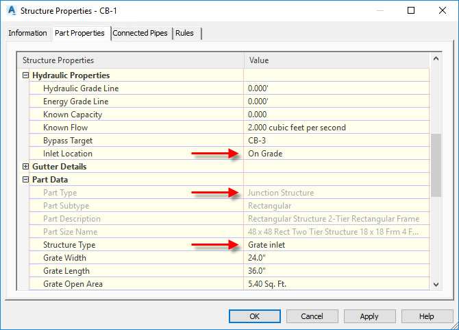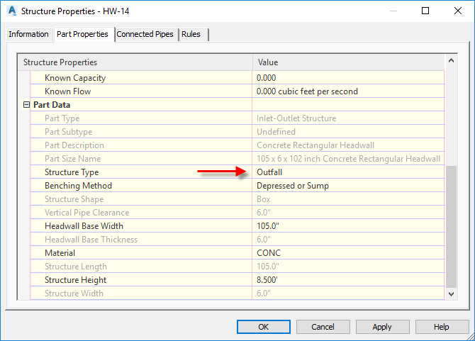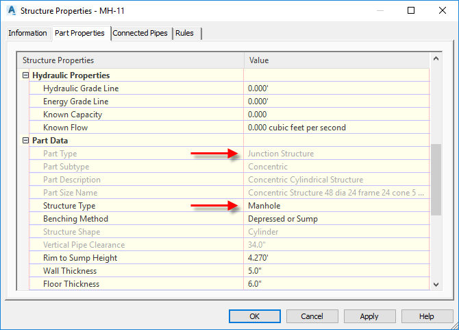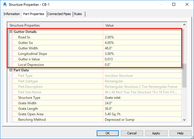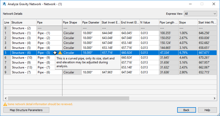 By mapping the parameters and applying them to the structures in existing pipe networks, you will not need to manually specify the values when you are using the Analyse Gravity Network command.
