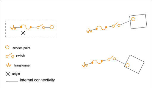 Example—This template for an electric feature arrangement can be used in residential areas to create the connections to service points. In residential areas, service points are commonly connected to a transformer using identical feature arrangements. A template speeds up data acquisition in this situation. This feature arrangement is not grouped: you can instantiate the template and then move each service point individually to its exact location without moving the other features.