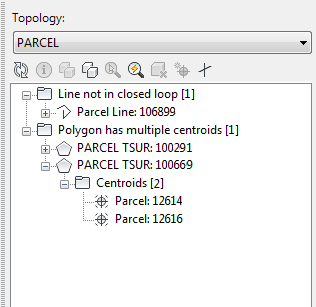 The Area Topology Checker dialog box lists all detected topology errors in a feature explorer.