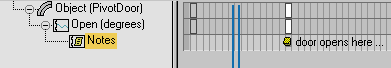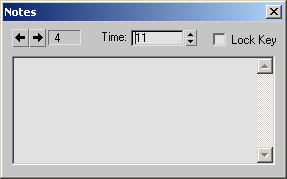 Adds or edits notes on the animation in Track View. Click within the text field and type a short one- or two-word description as the first line of your note. The first line of the note appears as a label to the right of the note key. Press Enter to start the body of the note. Close the Notes dialog by clicking the button at the top-right corner of the dialog.