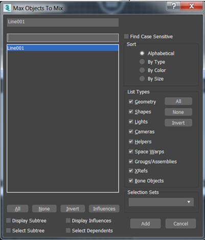 Opens the Max Objects To Mix dialog, which lists all non-biped objects in the scene. This dialog lets you add objects to be driven by your mixed animation, as well as name the mix in which they are contained.