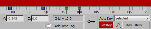 When the Set Keys button turns red, it sets a key which appears on the time ruler. The keys are color coded to reflect which tracks are being keyed.