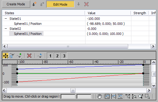 This is an example of the basis of the control mechanism used by the Reaction controller: For each master/slave combination, you can specify any number of states defined by values for the master and slave tracks. The first state, created automatically when you added the master, specifies that when the box is at –100 on the X axis, the sphere should be at (–100,0,50). In this case, you're controlling three parameters (the sphere position on all three axes) with one (the box position on the X axis). More typically you'd use one-to-one master/slave-parameter ratios.